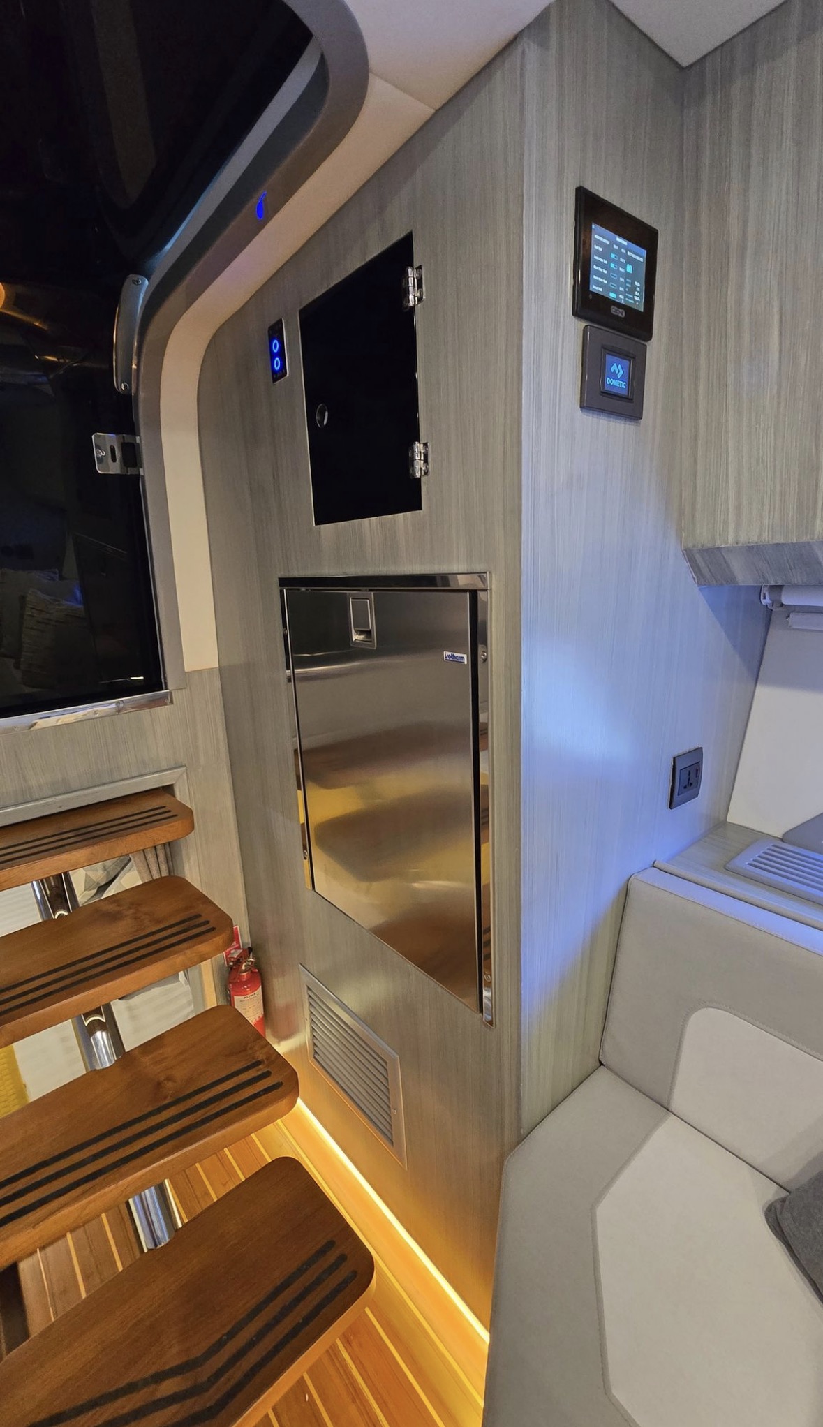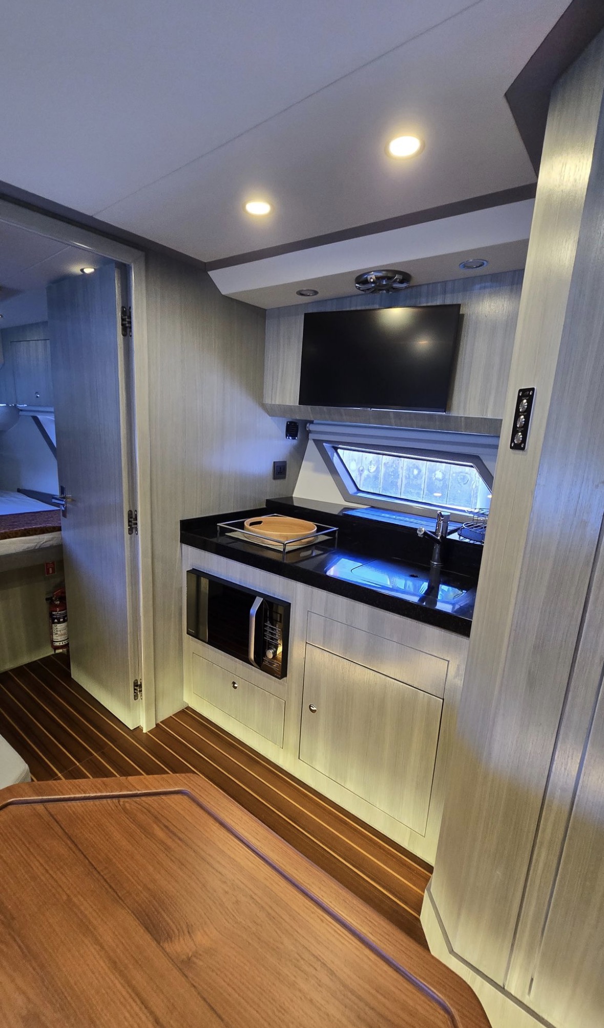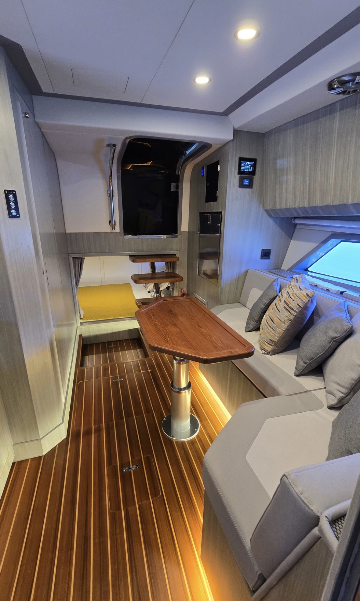 Well equipped: Shore power, solar panel 300 W , inverter, 3 lithium batteries,Radar, 2 GARMIN GPS 19 inch, Garmin autopilot, VHF, AIS, bow thruster, 3 monitoring cameras, Wet bar, ice maker, BBQ,fridge, ceramic cook top, oven/microwave, TV, FUSION stereo bluetooth with 8 speakers + subwoofer, search lights, underwater lights, external lights( colour changing), hardtop, retractable bimini, storage covers in navy Sunbrella, aft deck and bow deck cover, trim tabs and many extras… MUST BE SEE.