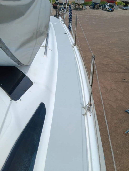 Boat actually on the hard, the hull been cleaned and primer painted, ready for antifouling and relaunch. The top deck has cleaned and painted.