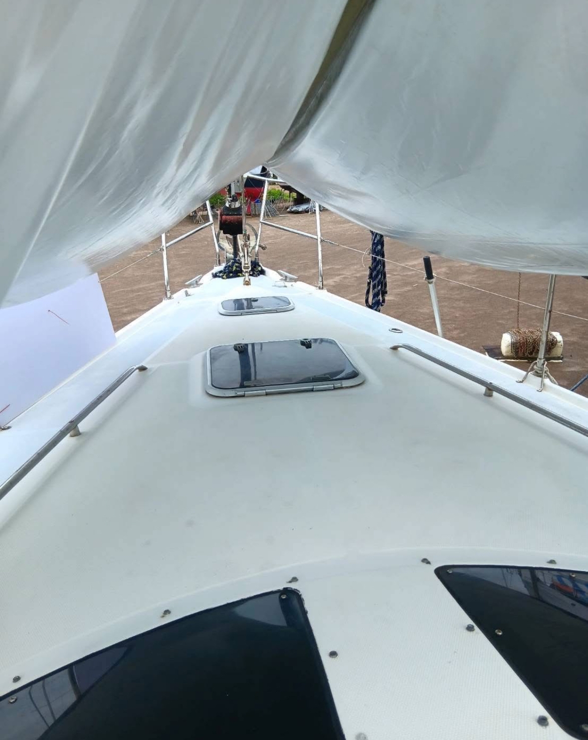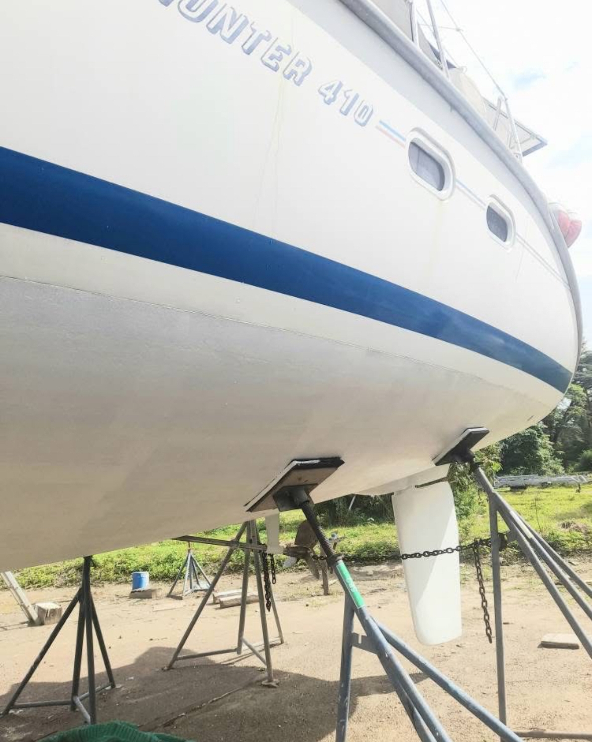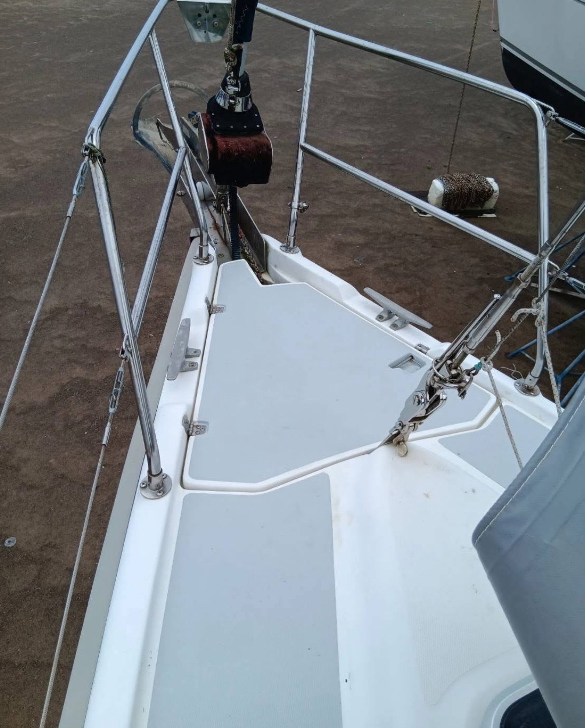 Boat actually on the hard, the hull been cleaned and primer painted, ready for antifouling and relaunch. The top deck has cleaned and painted.