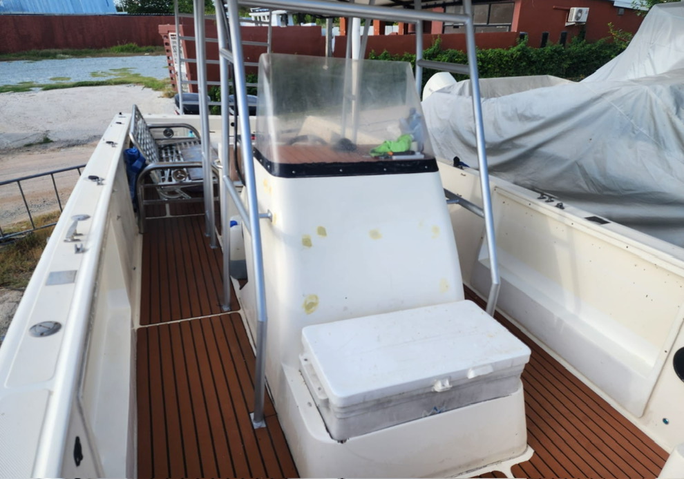 Length 12 meter, width 2,80 meter, center console, walkaround, cabin with toilet in front, large bimini.