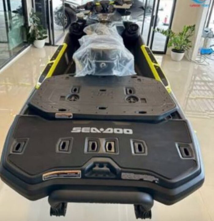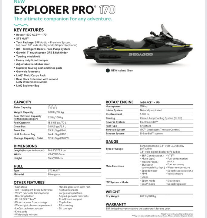 Tech package: BRP Audio- premium System, Full color 7.8″ wide display and USB port, GARMIN 7″ touchscreen GPS & fishfinder, touring windshield, Heavy duty front bumper, Adjustable handlebar riser, Explorer touring seat and knee pads, Gunwale Footrests, LinQ Multi cargo rack, Rear deck Extension with second LinQ attachment system, LinQ expolrer Bag, Glove box, storage 198,9 l., IBR intelligent Brake & reverse, Variable trim System, Watertight phone Compartment, Wide angle mirrors, Large swim Platform, Cup holder, ski tow eye, ECO & SPORT mode and many extras.