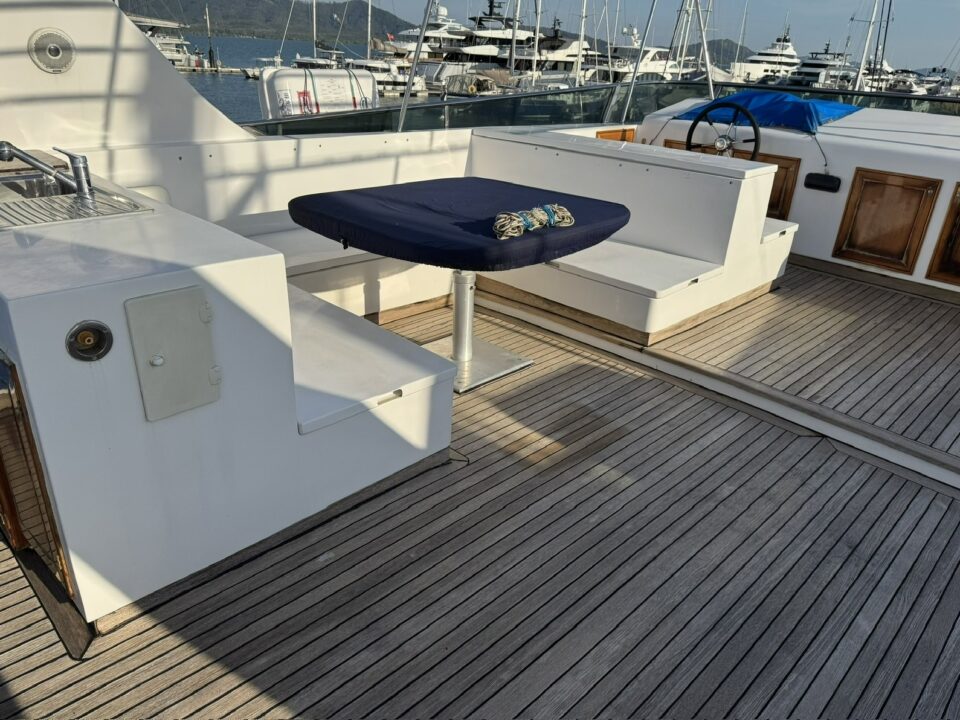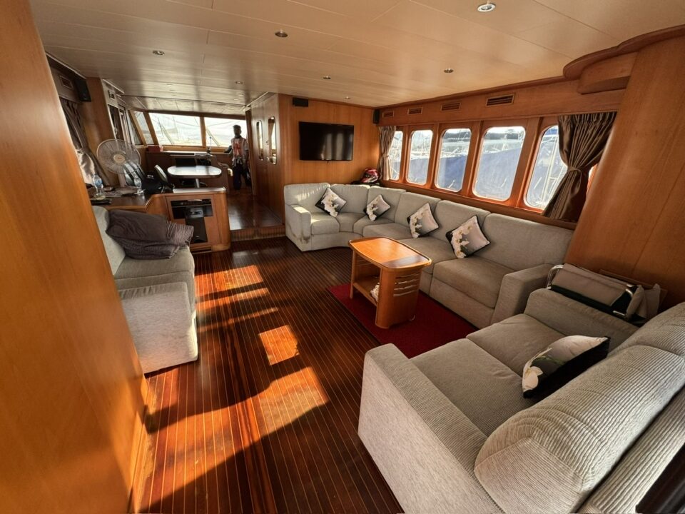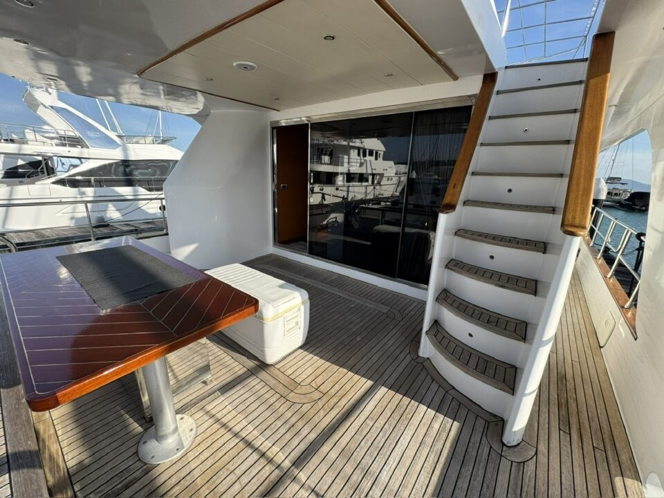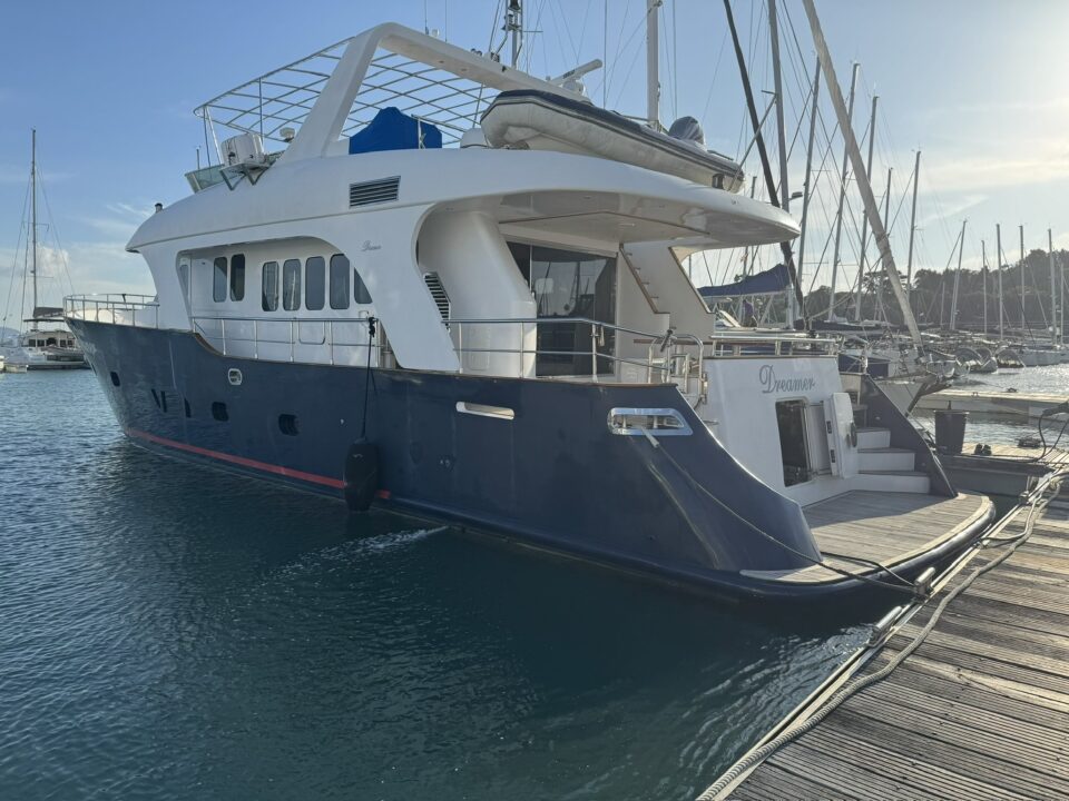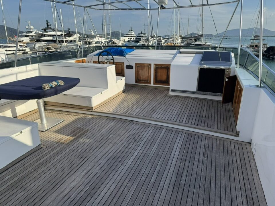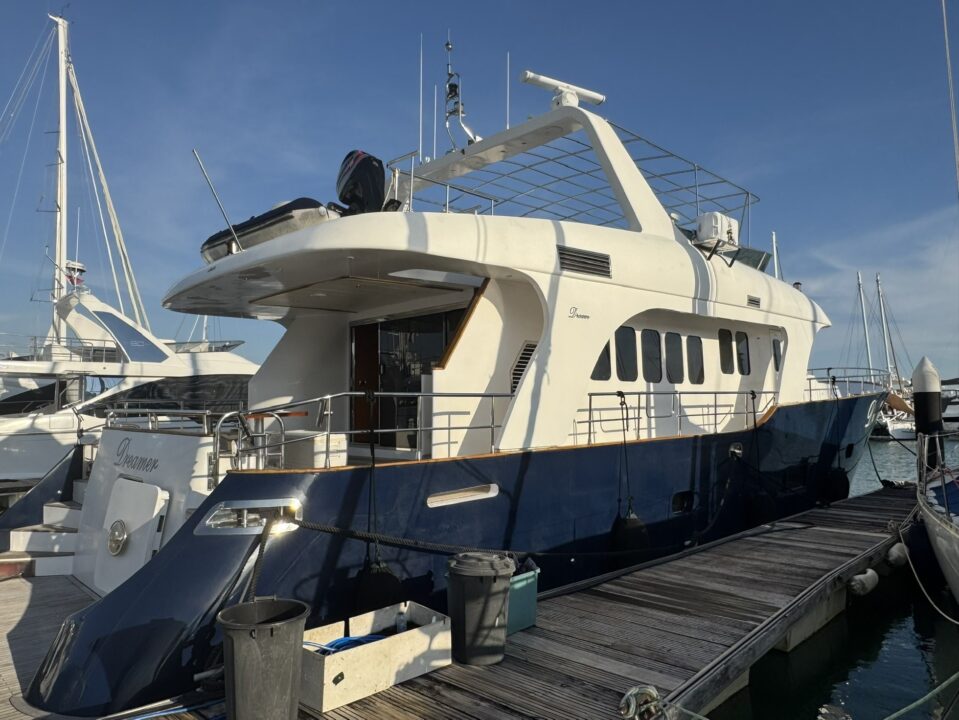 Length 23 meter, width 6.2 meter, high quality, 4 cabins, 4 bahthrooms, 2 crews cabins ( sleep 3) , spacious saloon, dinning area, kitchen, full air condition inside, large flybridge.